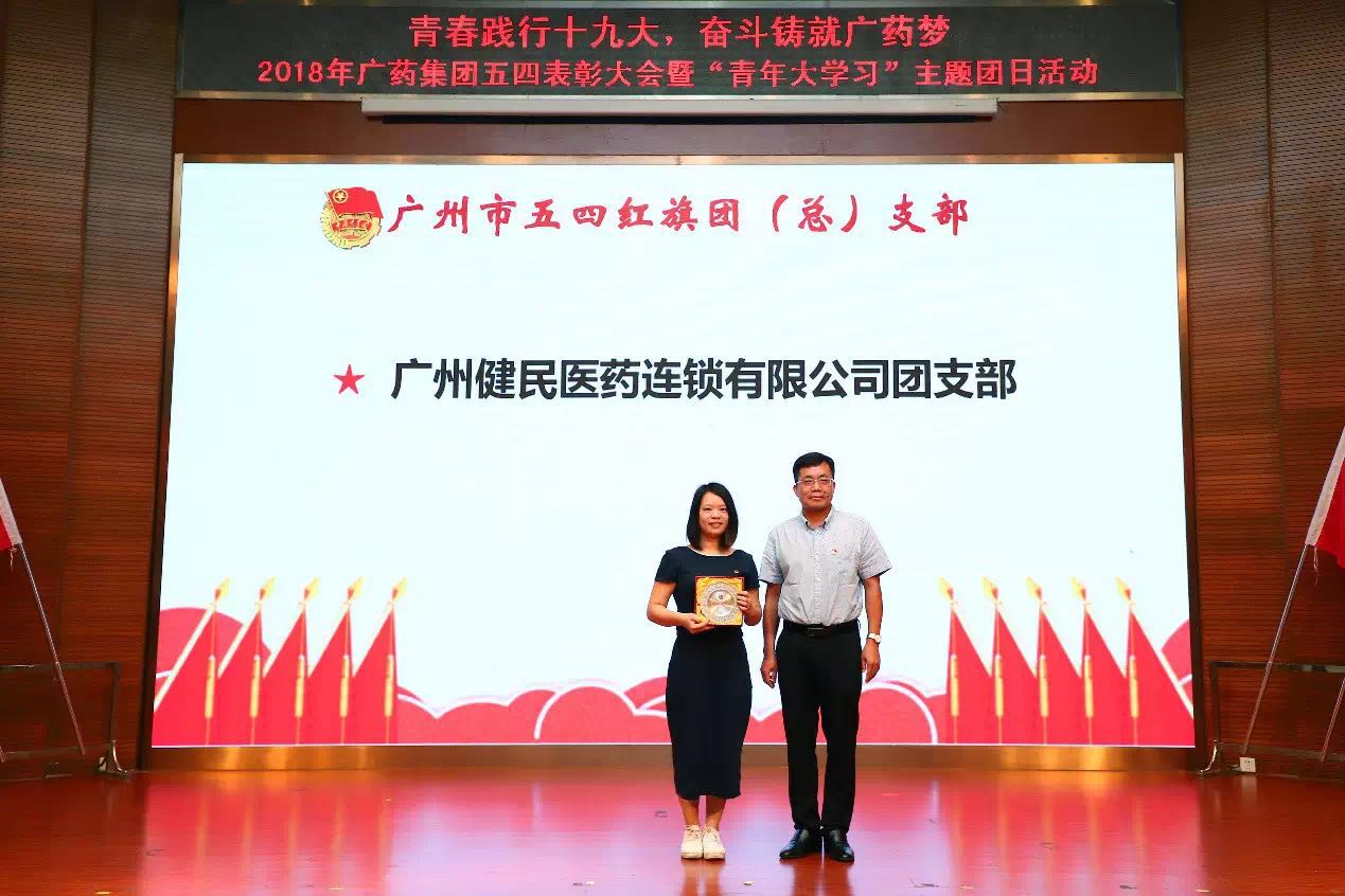 天心黨委書記陳昆南為“廣州市五四紅旗團(tuán)支部”——健民醫(yī)藥團(tuán)支部頒獎(jiǎng)